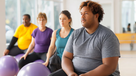 A man with obesity in a fitness class, working out alongside others, showing inclusion and effort.