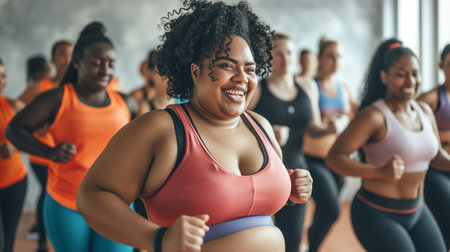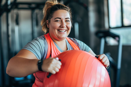 Active woman with obesity exercising and doing lunges at the gym. Overweight woman with a fitness lifestyle