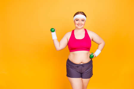 Fat woman dieting, fitness and healthy food at home.Big woman and sport. Health, fitness and sports concept. Plus size young caucasian woman doing exercise with dumbbells in cozy bedroom interior