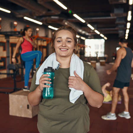 Active overweight woman with a towel for sweating resting after her cardio workout and drinking from a water bottle