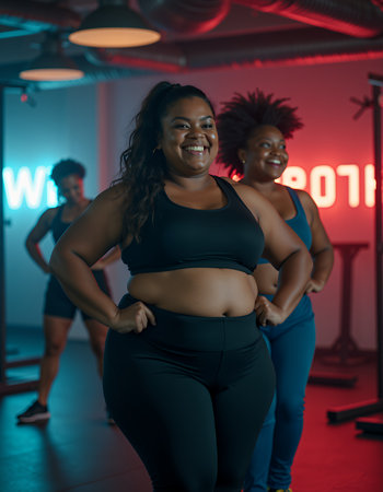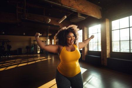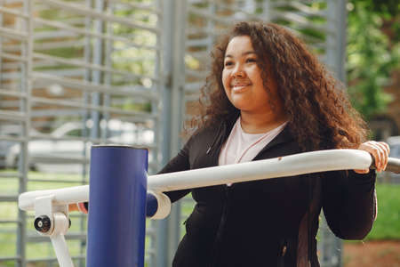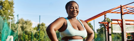 An African American woman in sportswear stands confidently in front of a playground, embracing her body positivity and strength.