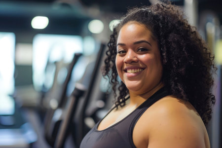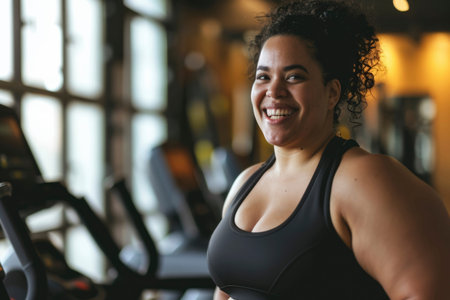 Active fat woman starting her run on a treadmil during her cardio workout at the gym