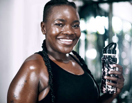 I always stay hydrated. Cropped portrait of an attractive young female athlete holding her water bottle while standing in the gym.