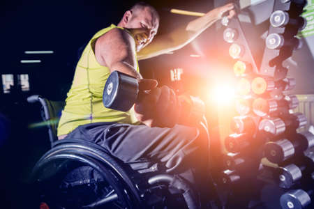 Man with disability exercising with dumbbells in wheelchair, demonstrating strength, resilience, and promoting inclusive fitness in modern gym
