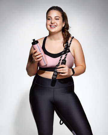 Sporty girl resting after workout with skipping rope. Photo of model with curvy figure in fashionable sportswear on gray background. Sports motivation and healthy lifestyle