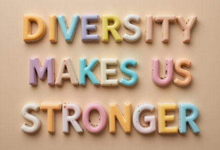Vibrant letters spell out a powerful message of diversity and strength, promoting inclusivity and unity. This colorful composition inspires positivity and connection.
