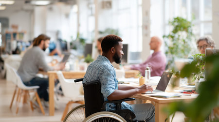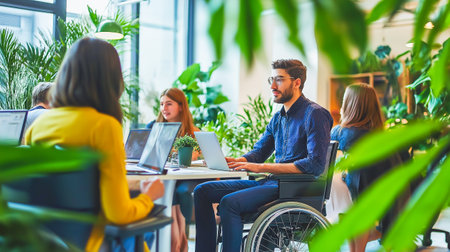 Coworkers collaborating around round table in open-plan office, with laptop charts and wheelchair. Collaboration, diversity, innovation, teamwork, accessibility, modern, workspace