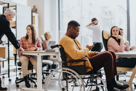 Handicapped male employee in a wheelchair seamlessly collaborates with colleagues, searching for information on his phone during work.