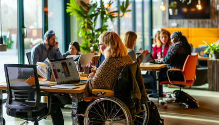 Diverse business team, including a woman in a wheelchair, collaborating around a wooden table in a modern coworking space, brainstorming and sharing ideas energetically