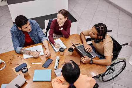 Top view at diverse group of young people studying together at table in college library, inclusivity concept