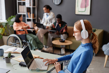 Side view portrait of red haired young woman wearing headphones in office while working with laptop, copy space