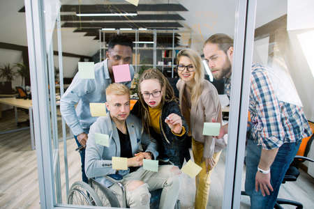 Inclusion for disabled people. Group of young multiracial business people with one handicapped man in wheelchair, discussing ideas in front of glass wall using post it notes and stickers.