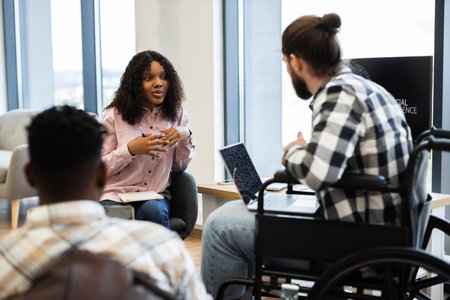 Team of three young adults and one mid adult discussing project in modern workspace. Diverse group with wheelchair user and mix of ethnicities fostering inclusion.