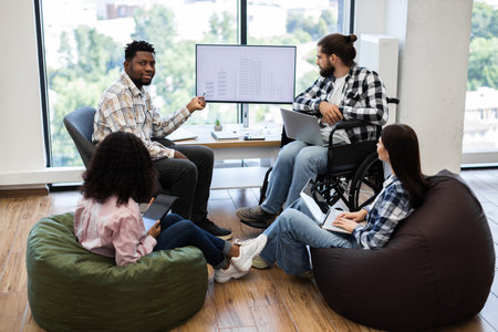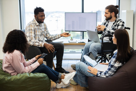 Multiracial team including young adult man in wheelchair collaborating on business presentation, discussing economic trends in open workspace. Evening meeting showcasing teamwork, inclusion
