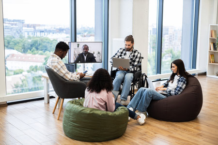 Group of multiracial coworkers, including disabled male, engaged in team meeting using video conference with male manager displayed on screen, embracing modern teamwork solutions in a casual office.
