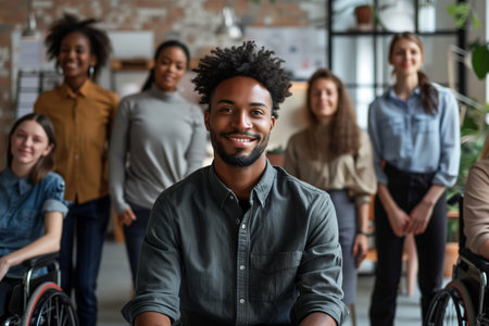 A diverse and confident group of young businessmen poses together, with businesswoman in wheelchair radiating success, ambition, and unity, capturing the essence of a dynamic and inspiring business environment