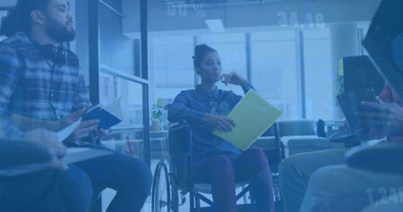 Image of financial data processing over diverse business people in office. Global business, finances, disability, computing and data processing concept digitally generated image.