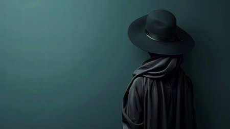 A mysterious figure draped in shadows creates an enigmatic contrast against a calming green backdrop. The wide-brimmed hat adds to the allure, inviting curiosity. Generated A.I.