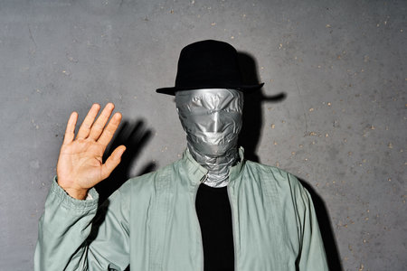 Close-up of a figure in a black hat, sunglasses, and draped fabric against a teal background, creating an air of mystery and anonymity.