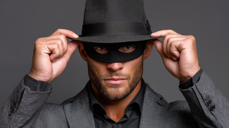 Thief in black balaclava and black cap looking at camera while standing against dark background.
