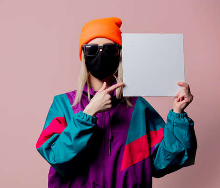 Style girl in 80s sportsuit and black face mask hold white square on pink background