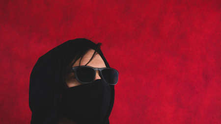 Mysterious person in a black hood and sunglasses against a vibrant red background.