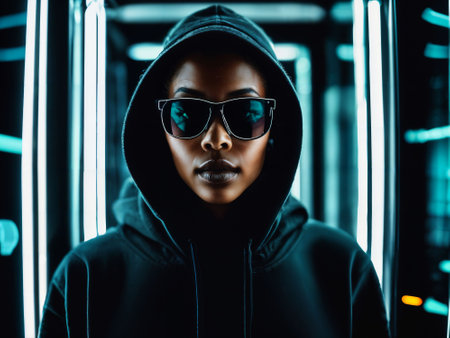 photo of black woman in black hoodie in server data center room with neon light, generative AI