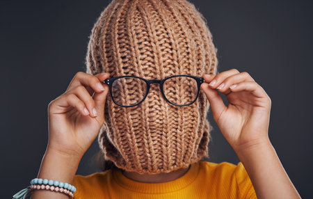 What do you think of my new look. an unrecognizable teenage girl wearing a beanie and feeling playful against a dark studio background.