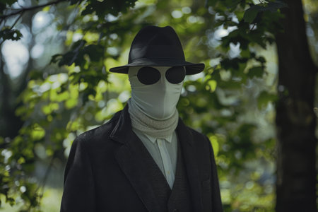 A mysterious figure dressed in a black hat and wool scarf conveys an air of secrecy and intrigue. The deep shadows and dramatic lighting enhance the aura of anonymity.