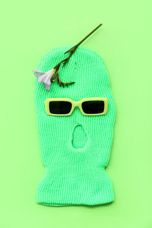 Male person with face mask, sunglasses and pink hat on neutral gray background - Generative AI.