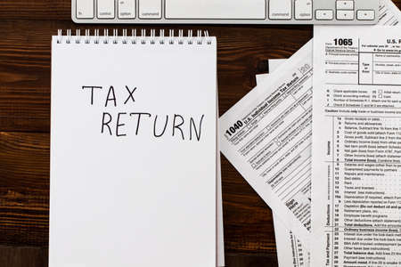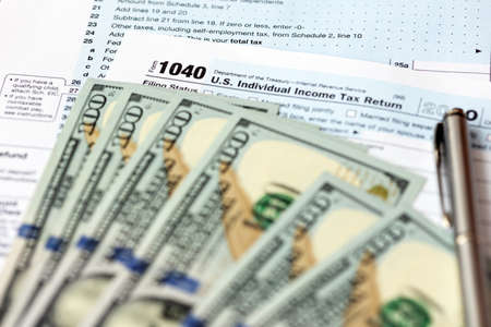 Tax season US tax form, dollar cash, finance accounting and blank notebook 1040 individual tax form