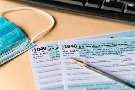 washington, usa - 3 march 2021: close up of form 1040 american income tax declaration form, symbol of usa taxes and economy during pandemic, with pen face mask and computer keyboard on table