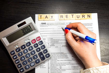Tax day. 1040 form and calculator on table ready to be filled and returned.