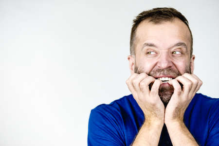 Adult man being scared and terryfied biting nails, having phobia seeing something scary. Studio shot