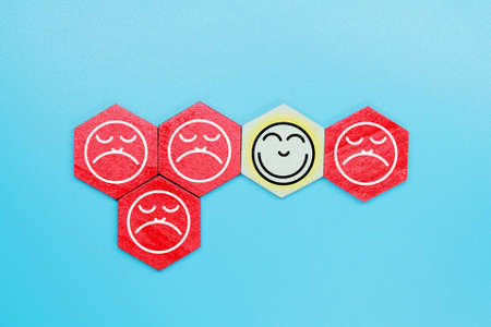 Positive and negative reactions, Change of attitude, creative concept, business and personal development, Blue brick with painted sad emoticon and yellow brick with a happy smile