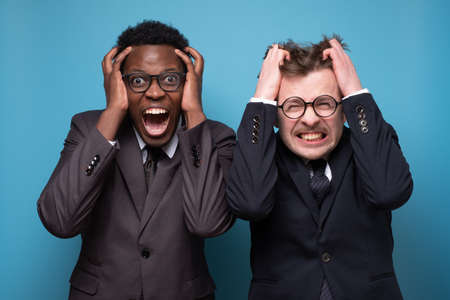 Portrait of two stressed colleagues, Caucasian businessman and Asian businesswoman, standing holding head in hands, looking at camera and screaming