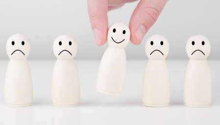 closeup businesswoman hand pointing on happy emotion face wooden doll arranged on table for satisfaction survey, mental health assessment