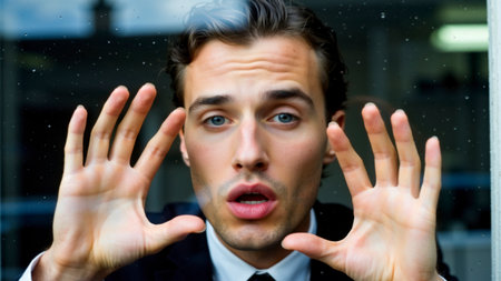 A young man in a suit presses his hands against a window pane with raindrops, looking out with a surprised or concerned expression, Generative AI.