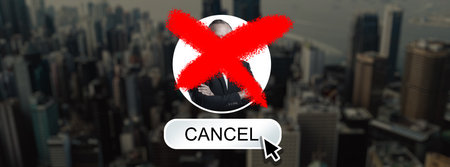 Man, cancel culture and boycott with censor to silence opinion, stop protest or shaming. Businessman, x or letter text overlay for censorship of public speaker or influencer in city or social media