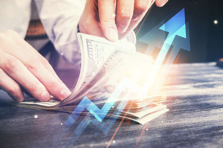 Multi exposure of arrows drawing hologram and USA dollars bills and man hands. Growth concept.