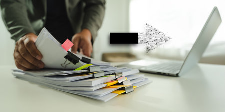 A digital transformation person organizing paperwork on desk with digital data transfer concept