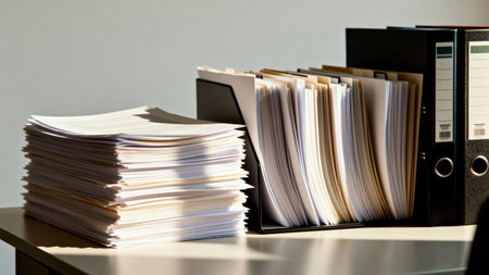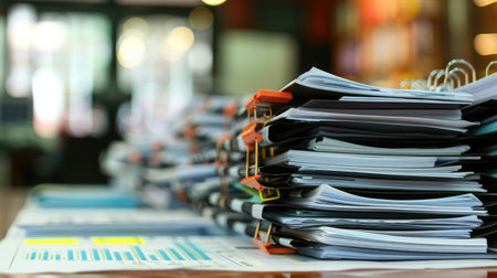 Large file stack on desk, paperwork heap in business office generated by artificial intelligence