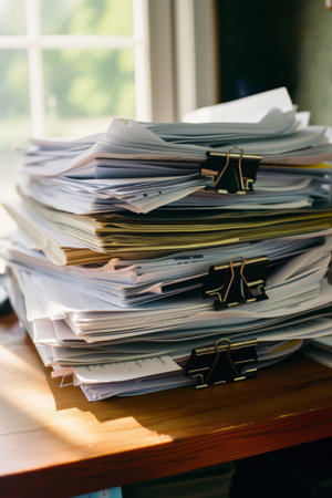 A stack of papers and folders on a desk in a busy workspace AI generated