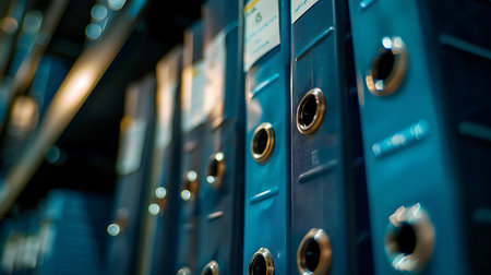 Bookcase with many binders. Typical bookshelf in a workplace.