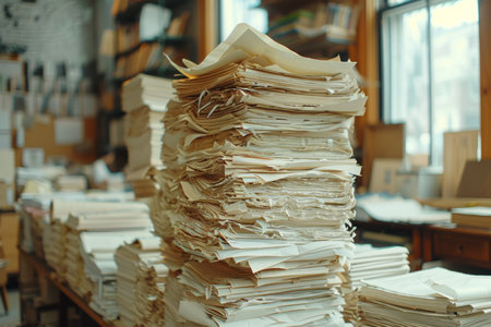 Piles of paper office filled with paperwork full archive file documents stack of folders information outdated old technology digitalization reports unorganized history messy research collection