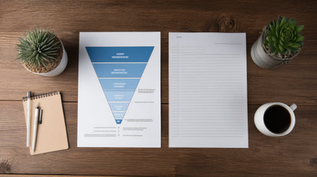 Startup marketing funnel diagram printed on paper next to growth plan and productivity tools