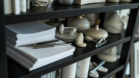 A close-up shot showcases a pristine stack of white paper and black pens neatly arranged on a shelf, perfectly complementing a minimalist home interior. Decorative accessories, including ceramic objects, enhance the contemporary aesthetic. This image evokes feelings of organization and creativity, ideal for illustrating workspaces, office supplies, or themes related to writing and design. It's a visually clean and elegant representation of a well-curated workspace, providing a stylish backdrop for various applications.