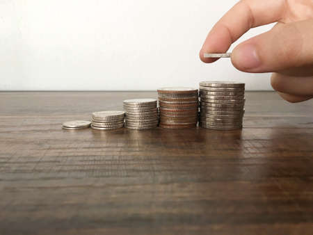 Women are stacking coins on top of the coin pile on the highest row. Placing coins in a row from low to high is comparable to saving money to grow more. Money saving ideas for investing in funds.