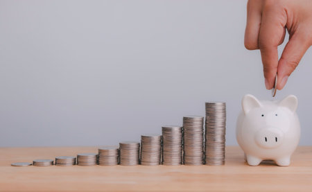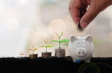 Business finance and saving money investment, Hand puting coin on white piggy bank and stacking coins saving concept for future. Balance savings and investment.