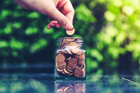 Woman hand putting coins in jar glass. Saving Money for prepare in the future. Saving money concept.